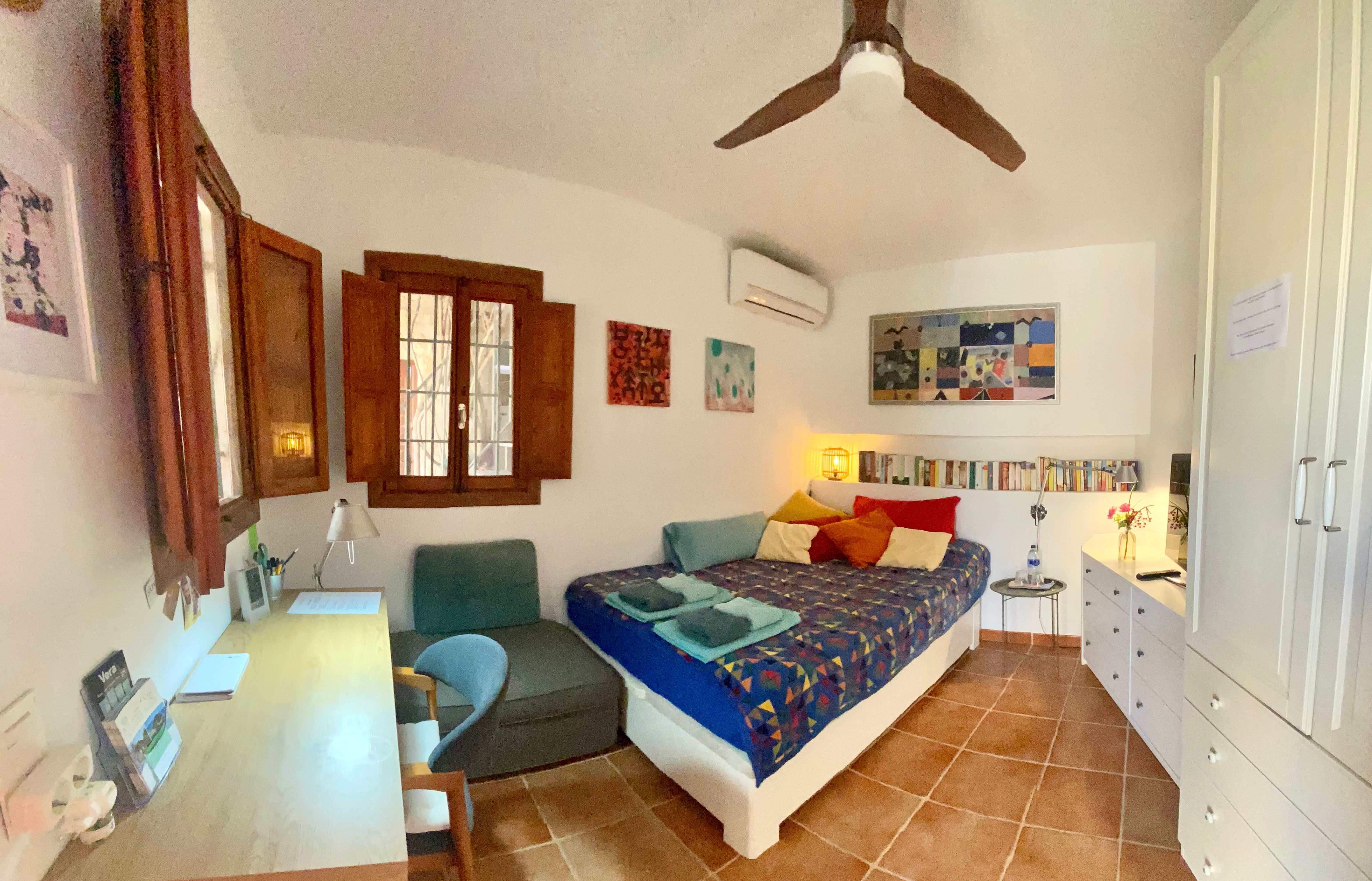 Das romantische 1-Zimmer-Minihaus mit Bad en suite liegt im mediterran begrünten Innenhof mit Palme und hat seinen eigenen Außenbereich. Dazu gehört eine Lounge-Ecke, Esstisch, Stühle und eine Hängematte. Das Zimmer ist mit einem Queensize-Bett (140 cm), Schrank, Kommode, Sessel und Schreibtisch ausgestattet. Ebenso verfügt es über Sat-TV, WLAN / WiFi, Aircondition und Heizung. Im Patio steht eine voll ausgestattete Outdoor-Küche zur Verfügung - oder bei Regen die Hausküche und ein überdachter Sitz-/Essbereich. Zum Haus gehören 2 liebenswerte, absolut harmlose Hunde (Galgo und Podenco-Mix)